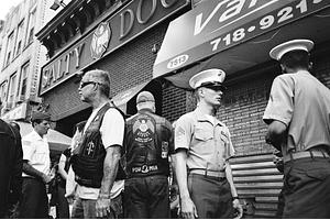 Servicemen gather outside local neighborhood pub to celebrate Veteran's Day. Bay Ridge, Brooklyn, NY. Photograph by © Jessica Chen